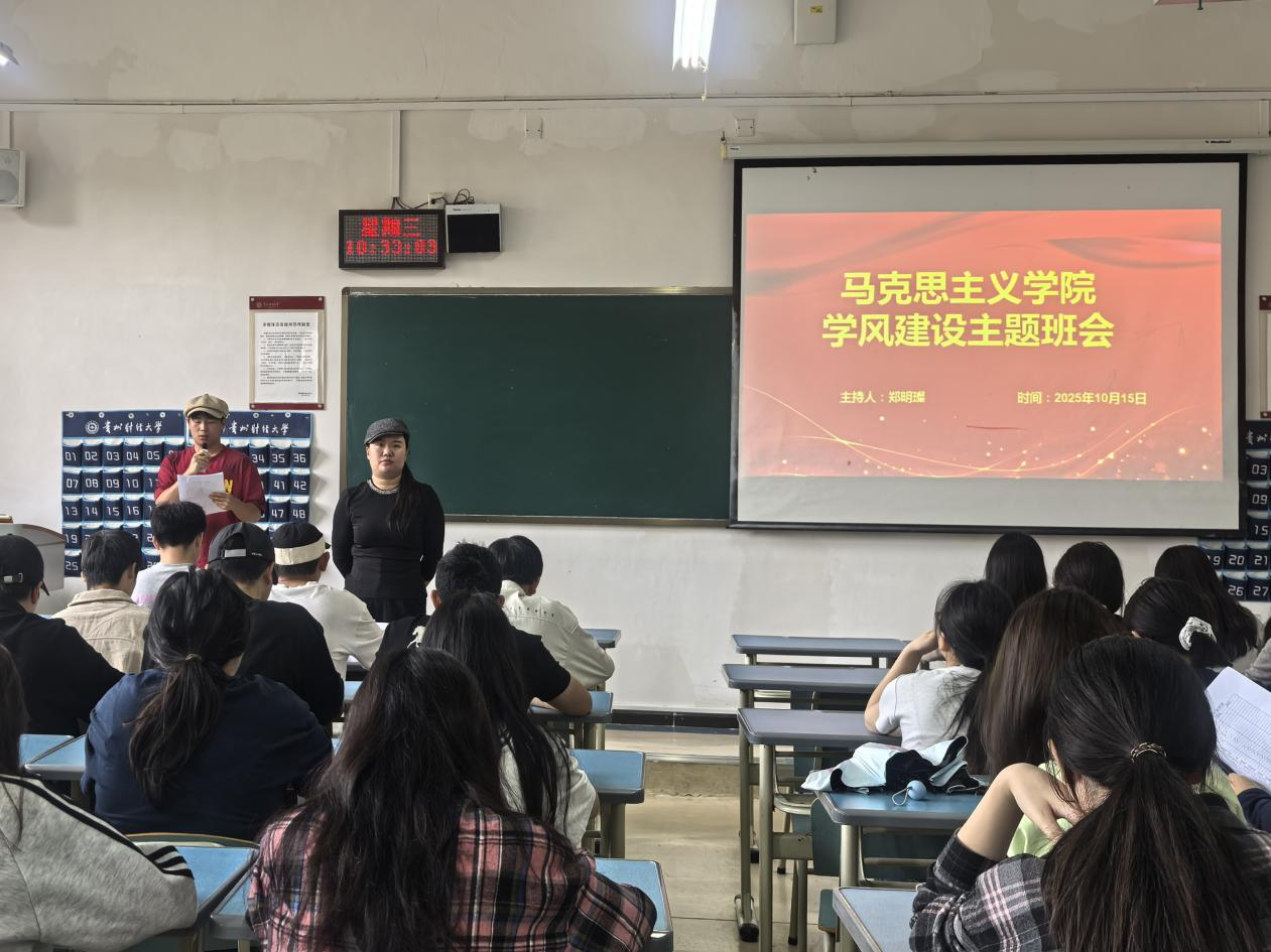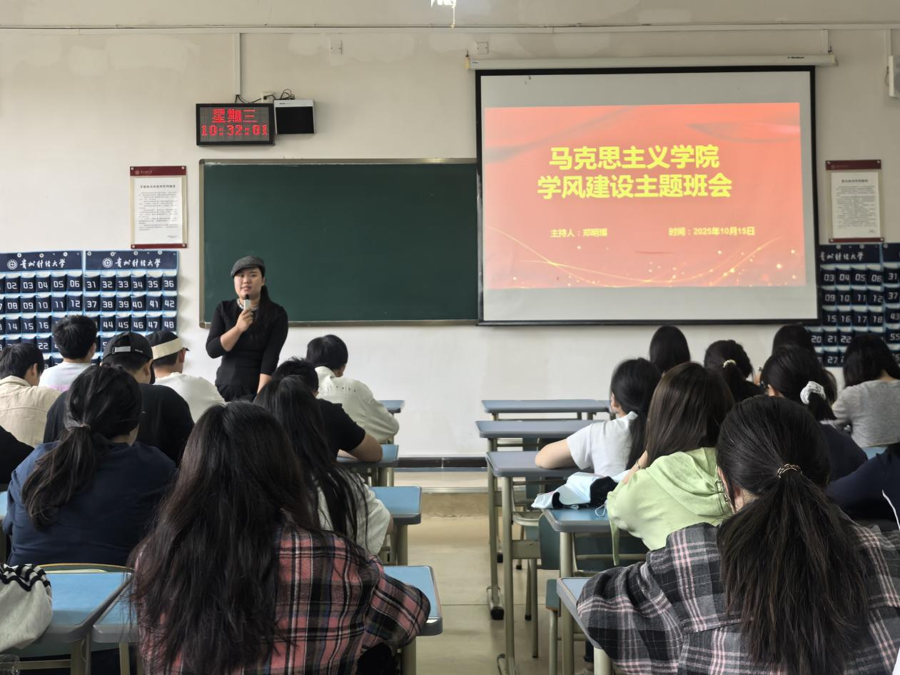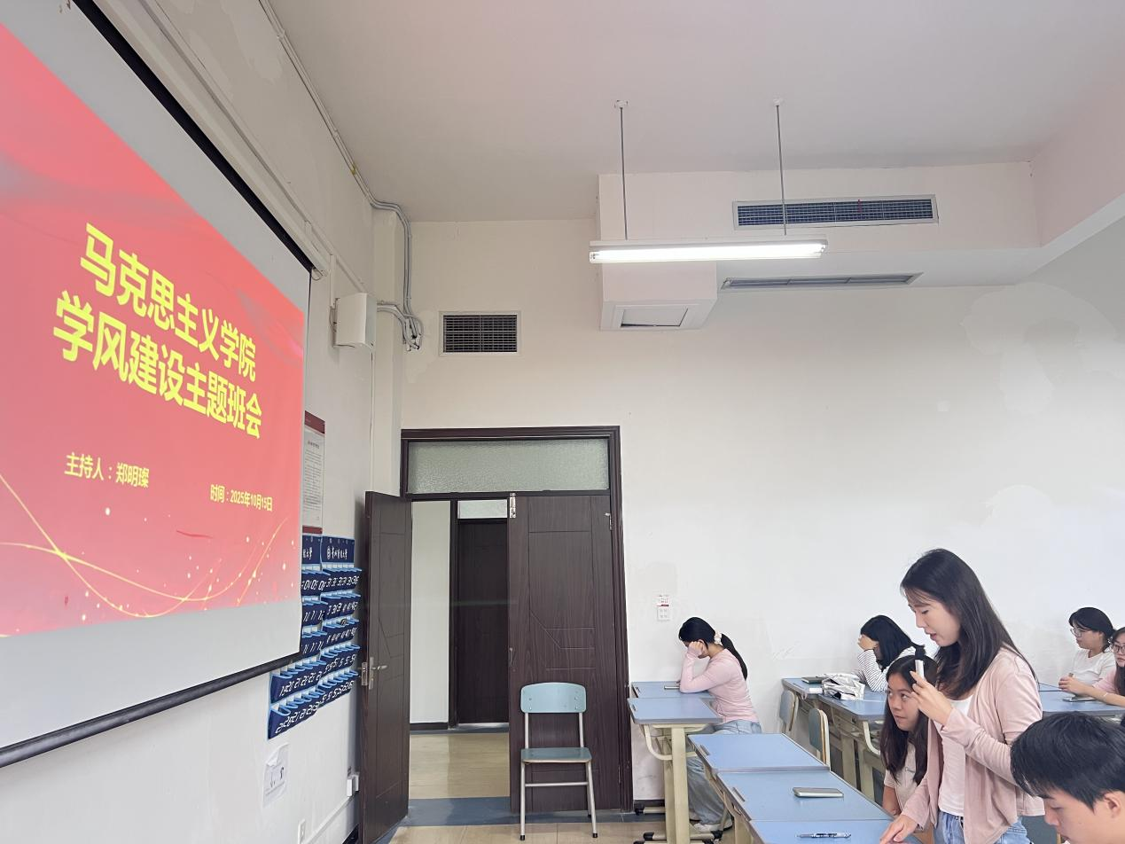 全体本科生于博学楼217教室召开学风建设主题班会,参加本次主题班会有党委副书记肖静、马克思主义理论系主任杨俊、辅导员郑明璨及全体本科生。