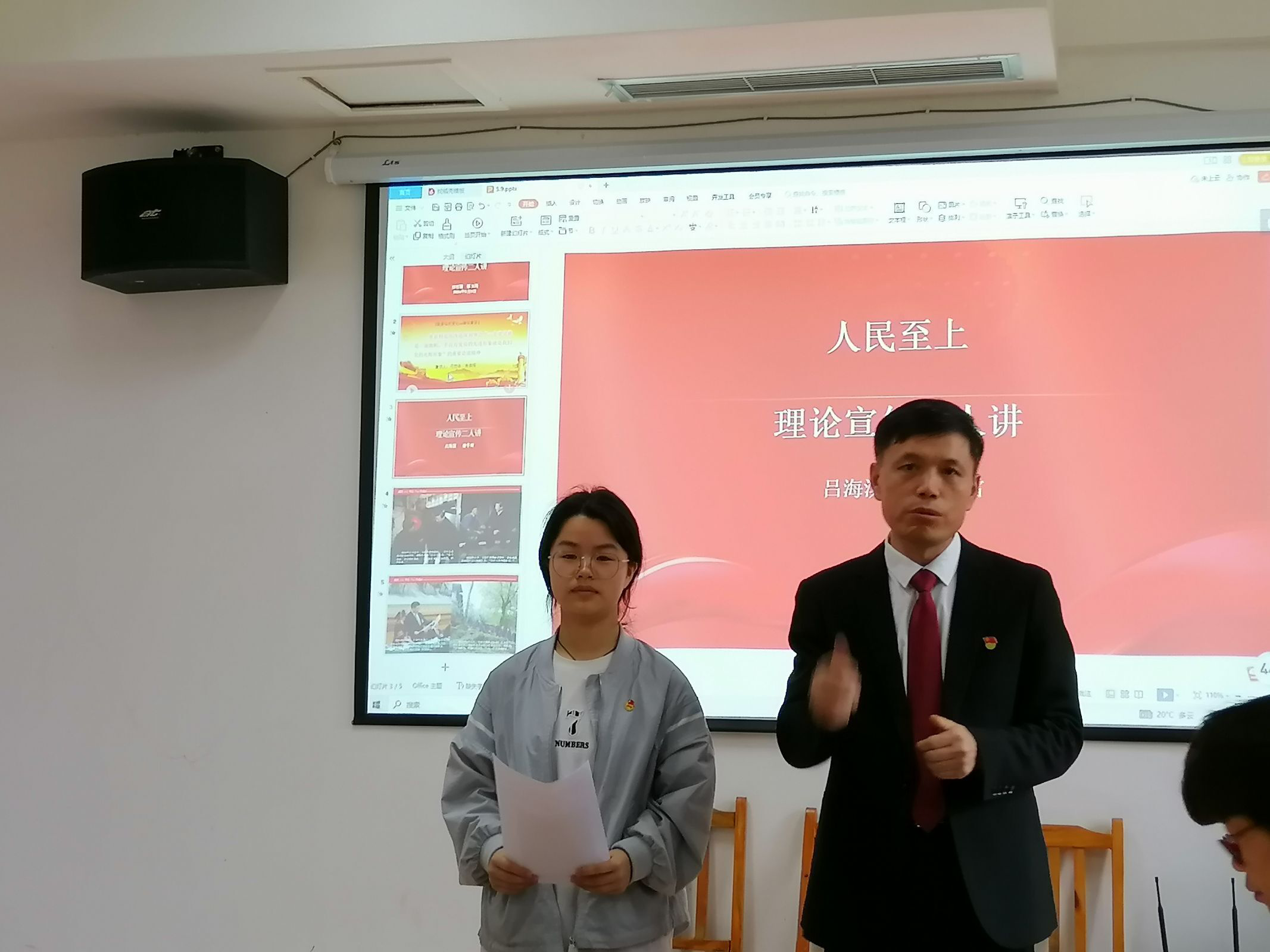 吕海滨副院长与潘冬雪同学的宣讲主题是《人民至上》,从“贵州好人”李仁贵的故事着手讲述“人民至上”的理念,体现了党和国家始终坚持人民至上的根本执政理念,充分体现了党的理想信念、性质宗旨和初心使命的统一。