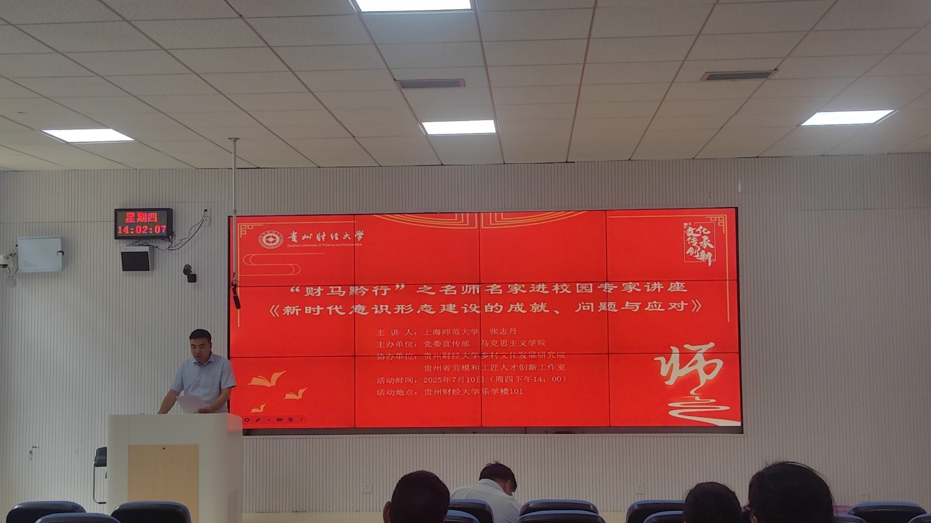 2025年7月10日下午,由贵州财经大学党委宣传部、i米体育 主办,贵州财经大学乡村文化发展研究院、贵州省劳模和工匠人才创新工作室协办的“财马黔行”之名师名家进校园活动,特邀上海师范大学i米体育 院长、马克思主义研究院院长张志丹教授以“新时代意识形态建设的成就、问题与应对”为主题开展学术讲座。参加本次讲座的师生共60余人,由和思鹏教授主持。